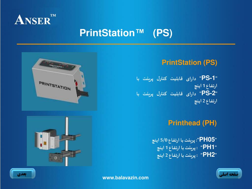 PrintStation™(PS) PrintStation(PS) "PS-1" دارای قابلیت کنترل پرینت با ارتفاع 1 اینچ "PS-2" دارای قابلیت کنترل پرینت با ارتفاع 2 اینچ Printhead (PH) "PH05": پرینت با ارتفاع 5/0 اینچ "PH1”: پرینت با ارتفاع 1 اینچ "PH2”: پرینت با ارتفاع 2 اینچ www.balavazin.com
