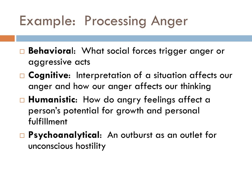 Example: Processing Anger • Behavioral: What social forces trigger anger or aggressive acts • Cognitive: Interpretation of a situation affects our anger and how our anger affects our thinking • Humanistic: How do angry feelings affect a person’s potential for growth and personal fulfillment • Psychoanalytical: An outburst as an outlet for unconscious hostility