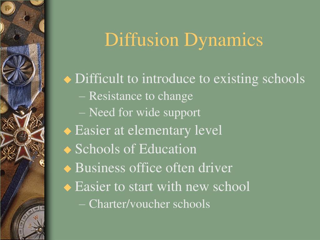 Diffusion Dynamics • Difficult to introduce to existing schools • Resistance to change • Need for wide support • Easier at elementary level • Schools of Education • Business office often driver • Easier to start with new school • Charter/voucher schools