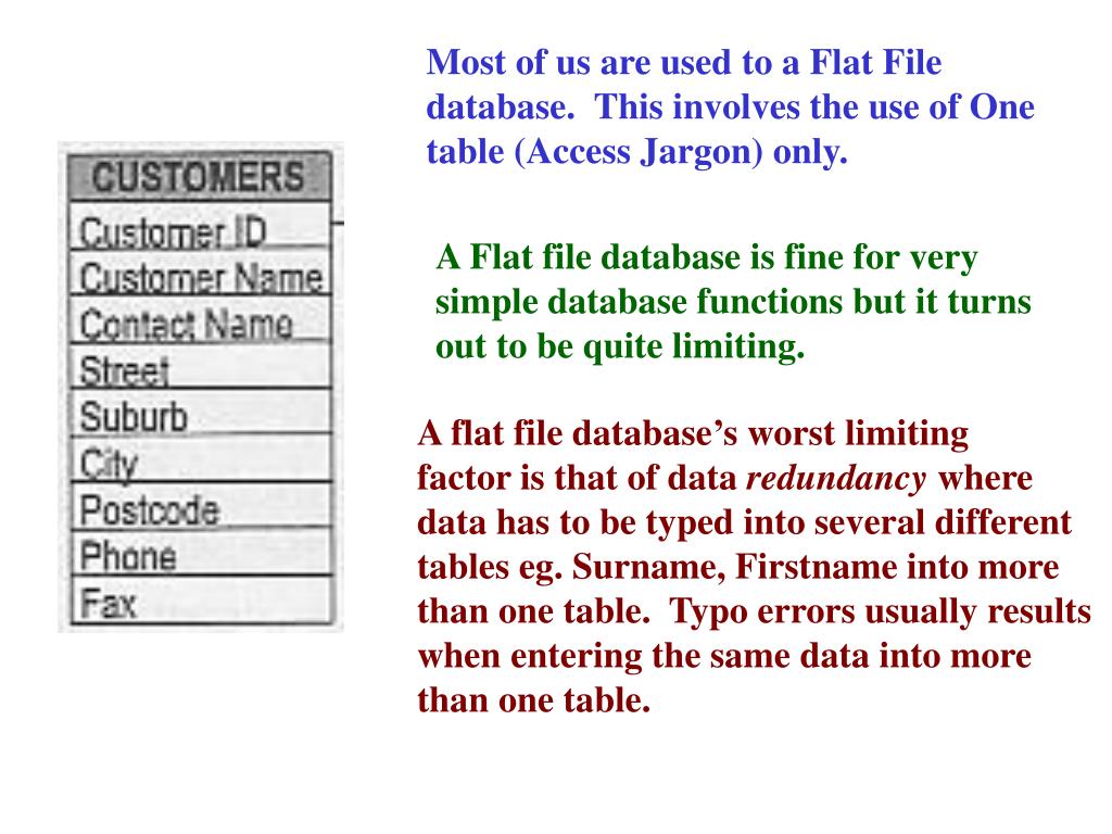 Most of us are used to a Flat File database. This involves the use of One table (Access Jargon) only. A Flat file database is fine for very simple database functions but it turns out to be quite limiting. A flat file database’s worst limiting factor is that of data redundancy where data has to be typed into several different tables eg. Surname, Firstname into more than one table. Typo errors usually results when entering the same data into more than one table.