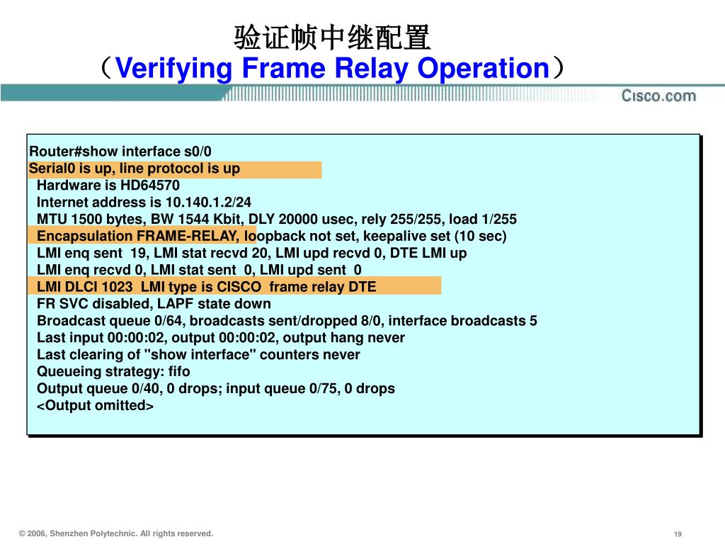 验证帧中继配置(Verifying Frame Relay Operation) Router#show interface s0/0 Serial0 is up, line protocol is up Hardware is HD64570 Internet address is 10.140.1.2/24 MTU 1500 bytes, BW 1544 Kbit, DLY 20000 usec, rely 255/255, load 1/255 Encapsulation FRAME-RELAY, loopback not set, keepalive set (10 sec) LMI enq sent 19, LMI stat recvd 20, LMI upd recvd 0, DTE LMI up LMI enq recvd 0, LMI stat sent 0, LMI upd sent 0 LMI DLCI 1023 LMI type is CISCO frame relay DTE FR SVC disabled, LAPF state down Broadcast queue 0/64, broadcasts sent/dropped 8/0, interface broadcasts 5 Last input 00:00:02, output 00:00:02, output hang never Last clearing of "show interface" counters never Queueing strategy: fifo Output queue 0/40, 0 drops; input queue 0/75, 0 drops <Output omitted>