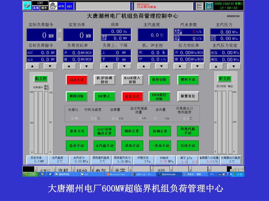 被控参数 • (1)给水流量/蒸汽流量 • 因为给水系统和蒸汽系统是直接连通的,且由于超临界锅炉直流蓄热能力较小,给水流量和蒸汽流量比率的偏差过大将导致较大的汽压波动。 • (2)煤水比 • 稳定运行工况时,煤水比必须维持不变,以保证过热器出口汽温为设计值。而在变动工况下,煤水比必须按一定规律改变,以便既充分利用锅炉蓄热能力,又按要求增减燃料,把锅炉热负荷调到与机组新的负荷相适应的水平. • (3)喷水流量/给水流量 • 超临界锅炉喷水仅能瞬时快速改变汽温.但不能始终维持汽温,因为过热受热面的长度和热焓都是不定的。为了保持通过改变喷水流量来校正汽温的能力,控制系统必须不断地把喷水流量和总给水流量之比恢复到设计值。 • (4)送风量/给煤量(风煤比) • 为了抑制NOx的产生,以及锅炉的经济、安全运行,需对各燃烧器的进风量进行控制,具体是通过各层燃烧器的二次风门和燃尽风门控制风量,每层风量根据负荷对应的风煤比来控制。
