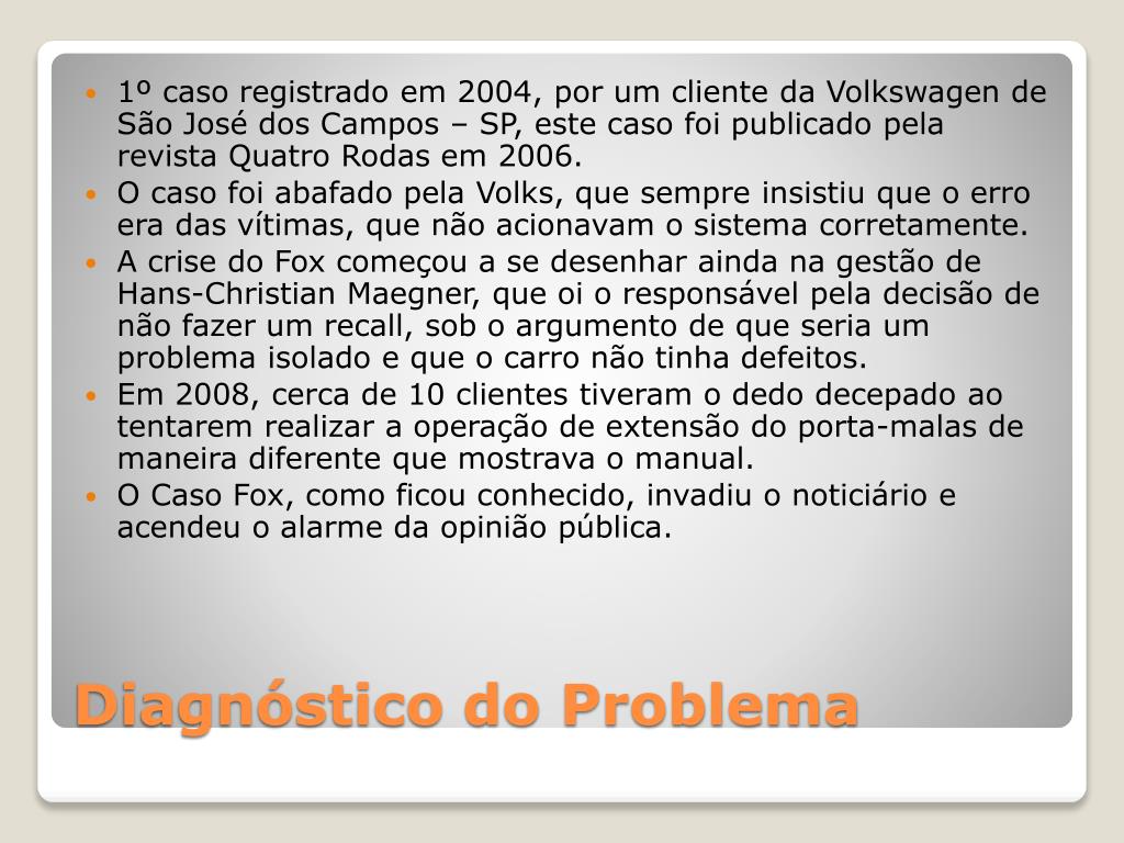 1º caso registrado em 2004, por um cliente da Volkswagen de São José dos Campos – SP, este caso foi publicado pela revista Quatro Rodas em 2006. • O caso foi abafado pela Volks, que sempre insistiu que o erro era das vítimas, que não acionavam o sistema corretamente. • A crise do Fox começou a se desenhar ainda na gestão de Hans-Christian Maegner, que oi o responsável pela decisão de não fazer um recall, sob o argumento de que seria um problema isolado e que o carro não tinha defeitos. • Em 2008, cerca de 10 clientes tiveram o dedo decepado ao tentarem realizar a operação de extensão do porta-malas de maneira diferente que mostrava o manual. • O Caso Fox, como ficou conhecido, invadiu o noticiário e acendeu o alarme da opinião pública. Diagnóstico do Problema