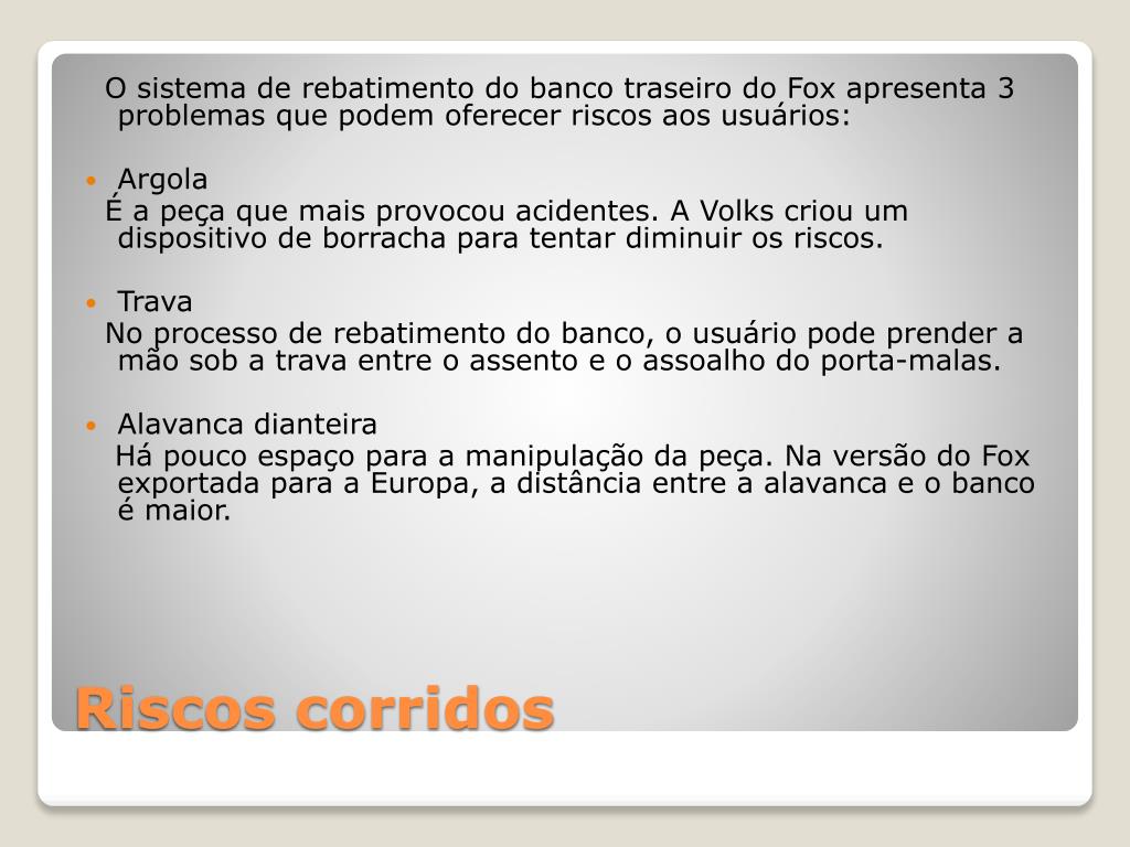 O sistema de rebatimento do banco traseiro do Fox apresenta 3 problemas que podem oferecer riscos aos usuários: • Argola É a peça que mais provocou acidentes. A Volks criou um dispositivo de borracha para tentar diminuir os riscos. • Trava No processo de rebatimento do banco, o usuário pode prender a mão sob a trava entre o assento e o assoalho do porta-malas. • Alavanca dianteira Há pouco espaço para a manipulação da peça. Na versão do Fox exportada para a Europa, a distância entre a alavanca e o banco é maior. Riscos corridos
