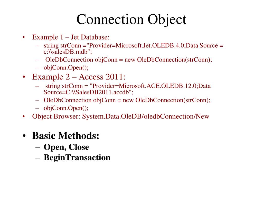 Connection Object • Example 1 – Jet Database: • string strConn ="Provider=Microsoft.Jet.OLEDB.4.0;Data Source = c:\\salesDB.mdb"; • OleDbConnection objConn = new OleDbConnection(strConn); • objConn.Open(); • Example 2 – Access 2011: • string strConn = "Provider=Microsoft.ACE.OLEDB.12.0;Data Source=C:\\SalesDB2011.accdb"; • OleDbConnection objConn = new OleDbConnection(strConn); • objConn.Open(); • Object Browser: System.Data.OleDB/oledbConnection/New • Basic Methods: • Open, Close • BeginTransaction