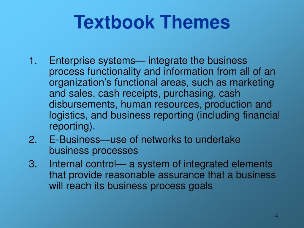 Textbook Themes • Enterprise systems— integrate the business process functionality and information from all of an organization’s functional areas, such as marketing and sales, cash receipts, purchasing, cash disbursements, human resources, production and logistics, and business reporting (including financial reporting). • E-Business—use of networks to undertake business processes • Internal control— a system of integrated elements that provide reasonable assurance that a business will reach its business process goals