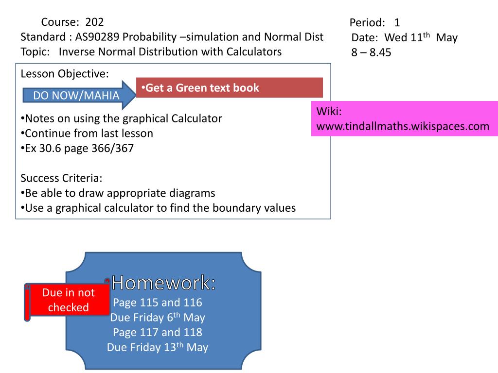 Course: 202 . Period: 1 . Standard : AS90289 Probability –simulation and Normal Dist Topic: Inverse Normal Distribution with Calculators. Date: Wed 11 th May 8 – 8.45. Lesson Objective: Notes on using the graphical Calculator Continue from last lesson
