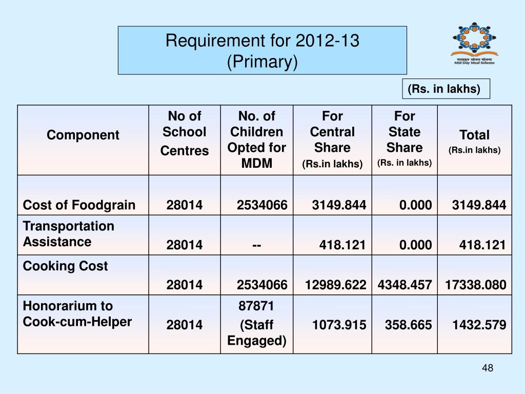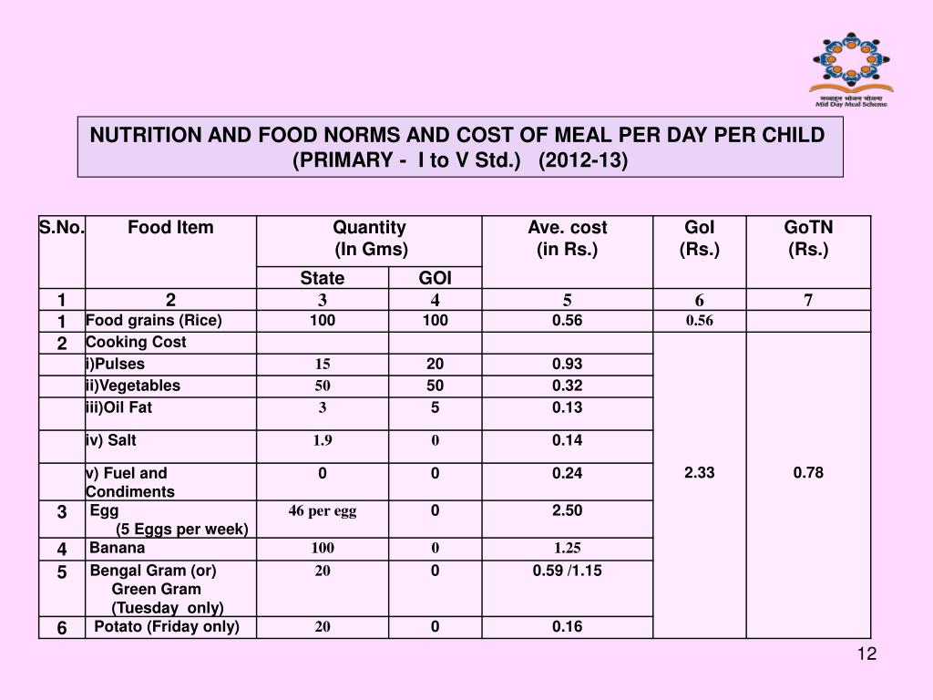 NUTRITION AND FOOD NORMS AND COST OF MEAL PER DAY PER CHILD (PRIMARY - I to V Std.) (2012-13)