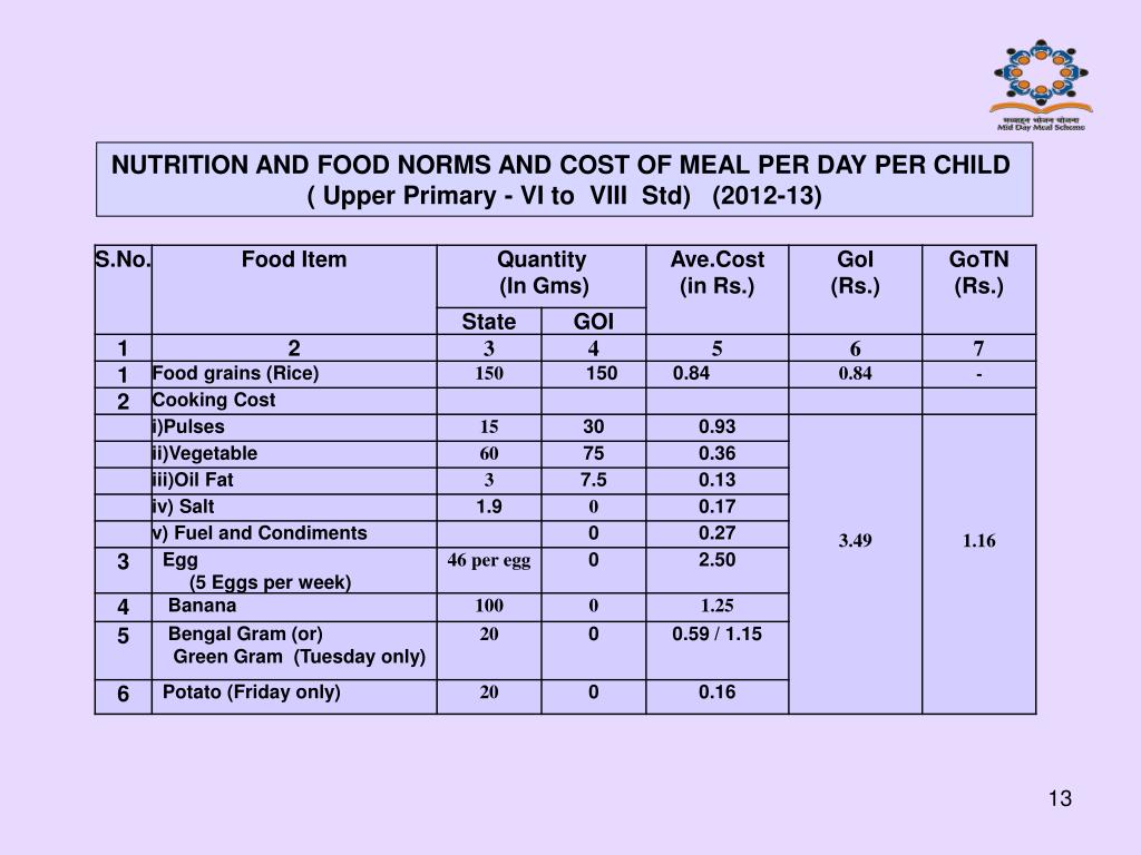 NUTRITION AND FOOD NORMS AND COST OF MEAL PER DAY PER CHILD ( Upper Primary - VI to VIII Std) (2012-13)