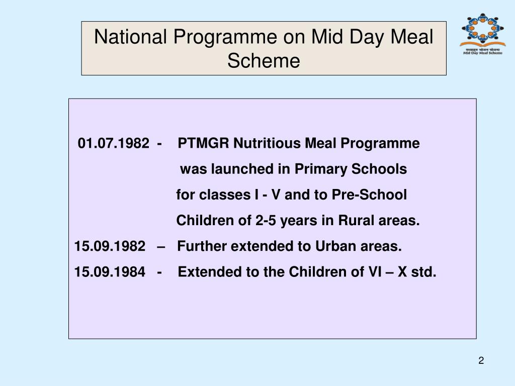 National Programme on Mid Day Meal Scheme 01.07.1982 - PTMGR Nutritious Meal Programme was launched in Primary Schools for classes I - V and to Pre-School Children of 2-5 years in Rural areas. 15.09.1982 – Further extended to Urban areas. 15.09.1984 - Extended to the Children of VI – X std.