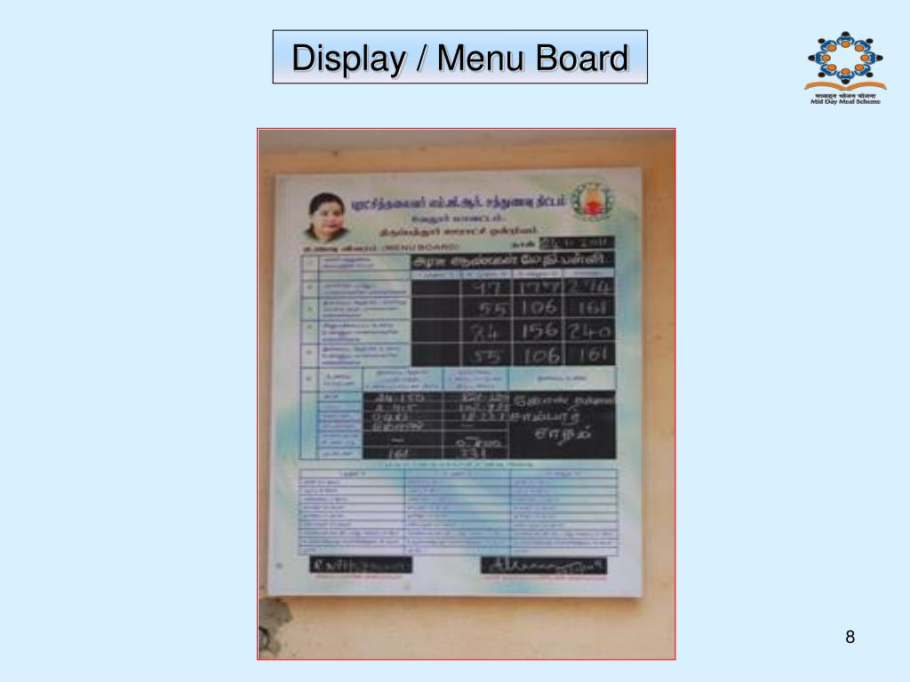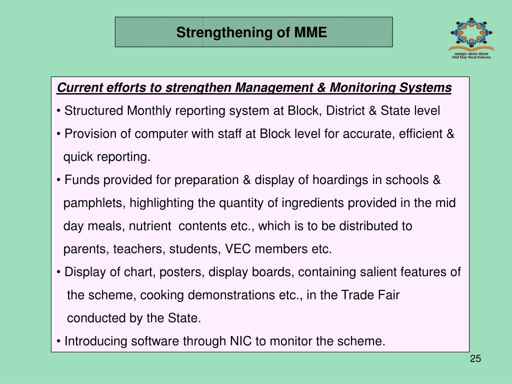 Strengthening of MME • Current efforts to strengthen Management & Monitoring Systems • Structured Monthly reporting system at Block, District & State level • Provision of computer with staff at Block level for accurate, efficient & • quick reporting. • Funds provided for preparation & display of hoardings in schools & • pamphlets, highlighting the quantity of ingredients provided in the mid • day meals, nutrient contents etc., which is to be distributed to • parents, teachers, students, VEC members etc. • Display of chart, posters, display boards, containing salient features of • the scheme, cooking demonstrations etc., in the Trade Fair • conducted by the State. • Introducing software through NIC to monitor the scheme.