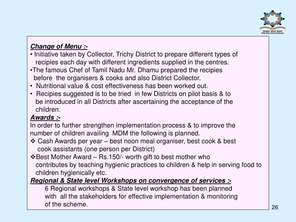 Change of Menu :- • Initiative taken by Collector, Trichy District to prepare different types of • recipies each day with different ingredients supplied in the centres. • The famous Chef of Tamil Nadu Mr. Dhamu prepared the recipies • before the organisers & cooks and also District Collector. • Nutritional value & cost effectiveness has been worked out. • Recipies suggested is to be tried in few Districts on pilot basis & to • be introduced in all Districts after ascertaining the acceptance of the • children. • Awards :- • In order to further strengthen implementation process & to improve the • number of children availing MDM the following is planned. • Cash Awards per year – best noon meal organiser, best cook & best cook assistants (one person per District) • Best Mother Award – Rs.150/- worth gift to best mother who contributes by teaching hygienic practices to children & help in serving food to children hygienically etc. Regional & State level Workshops on convergence of services :- 6 Regional workshops & State level workshop has been planned with all the stakeholders for effective implementation & monitoring of the scheme.