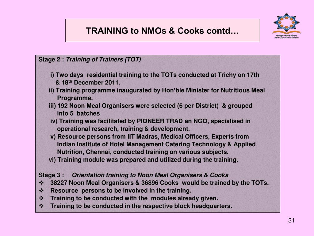 Stage 2 : Training of Trainers (TOT) i) Two days residential training to the TOTs conducted at Trichy on 17th & 18th December 2011. ii) Training programme inaugurated by Hon’ble Minister for Nutritious Meal Programme. iii) 192 Noon Meal Organisers were selected (6 per District) & grouped into 5 batches iv) Training was facilitated by PIONEER TRAD an NGO, specialised in operational research, training & development. v) Resource persons from IIT Madras, Medical Officers, Experts from Indian Institute of Hotel Management Catering Technology & Applied Nutrition, Chennai, conducted training on various subjects. vi) Training module was prepared and utilized during the training. Stage 3 : Orientation training to Noon Meal Organisers & Cooks 38227 Noon Meal Organisers & 36896 Cooks would be trained by the TOTs. Resource persons to be involved in the training. Training to be conducted with the modules already given. Training to be conducted in the respective block headquarters. TRAINING to NMOs & Cooks contd…