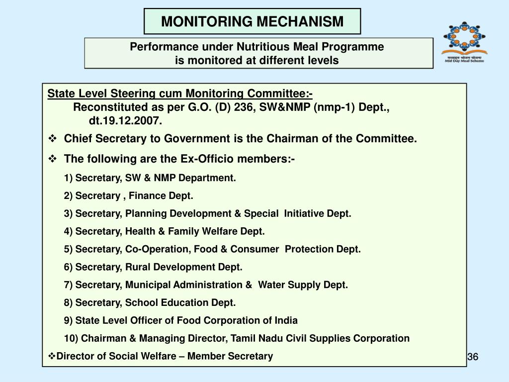 Mandatory Visits every month by District level Officers to Nutritious Meal Centres MONITORING MECHANISM As per G.O. (MS) No. 151SW & NMP Dept., dt. 13.08.2004, G.O. (MS) No. 153 SW & NMP (nmp-2) Dept., dt. 04.07.2005 & D.O. Letter No. 12926 / NMP – 2 /2011-1, dt. 29.10.2011, the following Officials have been allotted targets for NMP centres Inspection. (Per Month)