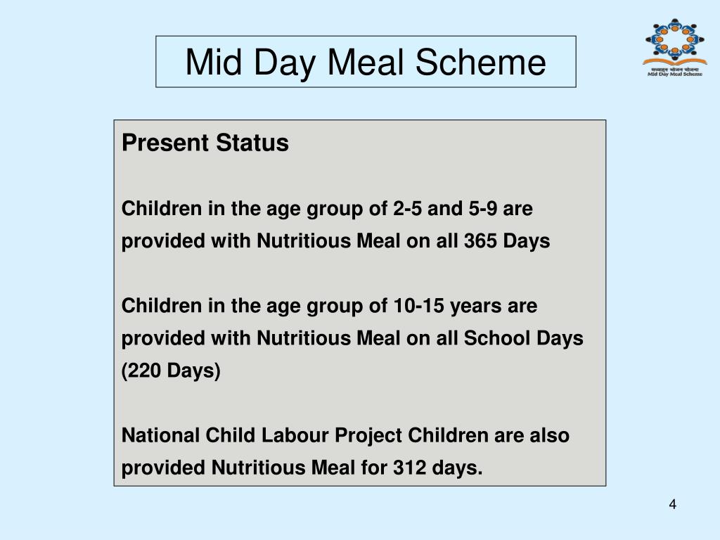 Mid Day Meal Scheme Present Status Children in the age group of 2-5 and 5-9 are provided with Nutritious Meal on all 365 Days Children in the age group of 10-15 years are provided with Nutritious Meal on all School Days (220 Days) National Child Labour Project Children are also provided Nutritious Meal for 312 days.