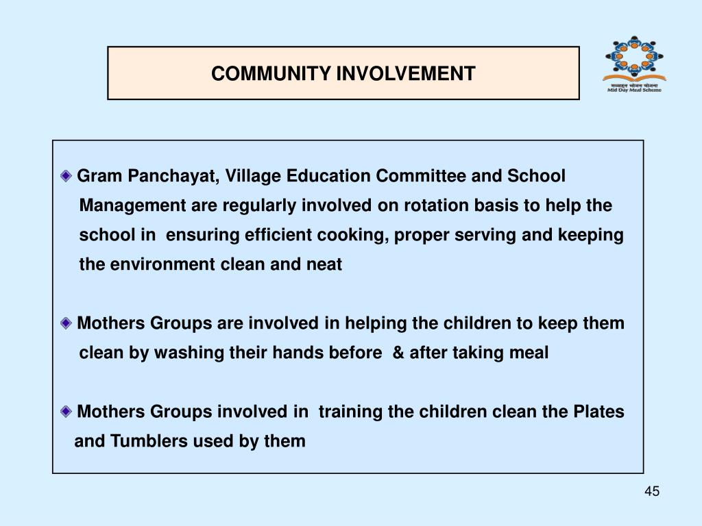 COMMUNITY INVOLVEMENT • Gram Panchayat, Village Education Committee and School • Management are regularly involved on rotation basis to help the • school in ensuring efficient cooking, proper serving and keeping • the environment clean and neat • Mothers Groups are involved in helping the children to keep them • clean by washing their hands before & after taking meal • Mothers Groups involved in training the children clean the Plates • and Tumblers used by them