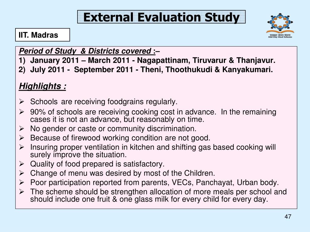 Period of Study & Districts covered :– January 2011 – March 2011 - Nagapattinam, Tiruvarur & Thanjavur. July 2011 - September 2011 - Theni, Thoothukudi & Kanyakumari. Highlights : Schoolsare receiving foodgrains regularly. 90% of schools are receiving cooking cost in advance. In the remaining cases it is not an advance, but reasonably on time. No gender or caste or community discrimination. Because of firewood working condition are not good. Insuring proper ventilation in kitchen and shifting gas based cooking will surely improve the situation. Quality of food prepared is satisfactory. Change of menu was desired by most of the Children. Poor participation reported from parents, VECs, Panchayat, Urban body. The scheme should be strengthen allocation of more meals per school and should include one fruit & one glass milk for every child for every day. External Evaluation Study IIT. Madras