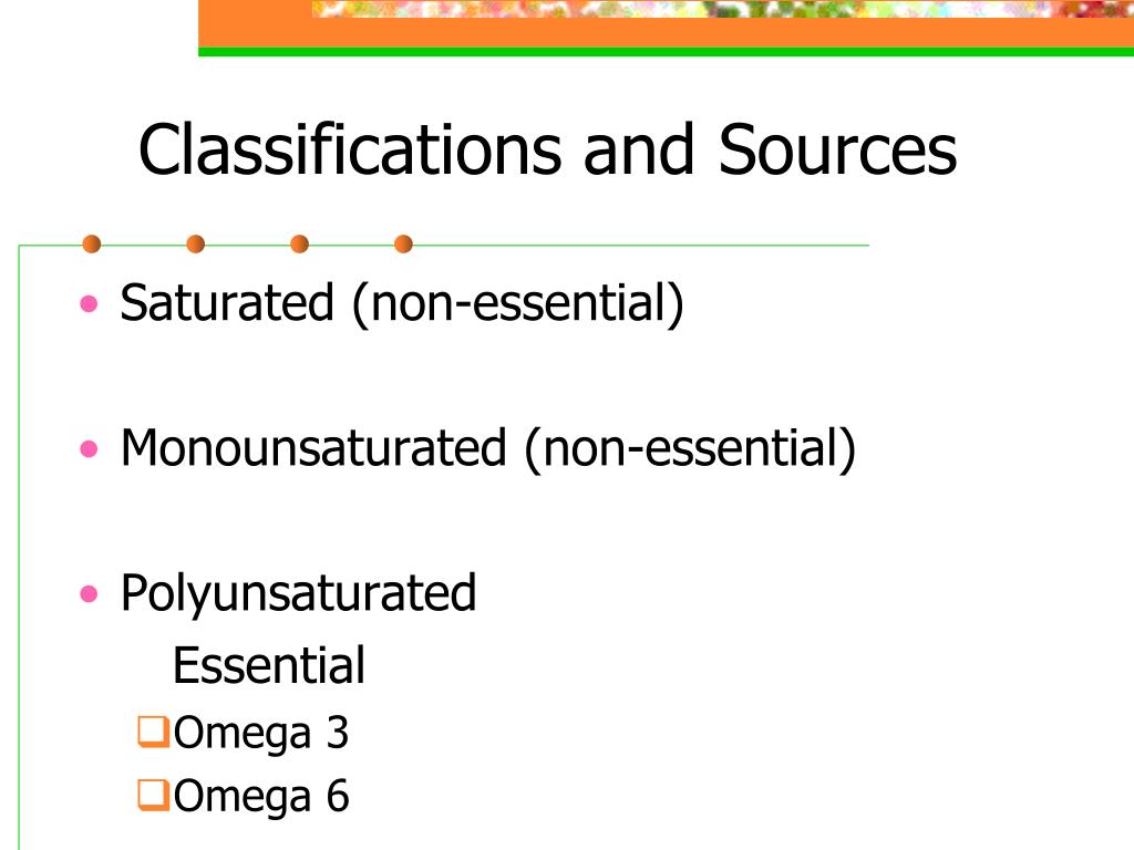 Classifications and Sources • Saturated (non-essential) • Monounsaturated (non-essential) • Polyunsaturated Essential • Omega 3 • Omega 6