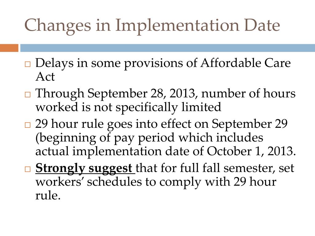 Changes in Implementation Date • Delays in some provisions of Affordable Care Act • Through September 28, 2013, number of hours worked is not specifically limited • 29 hour rule goes into effect on September 29 (beginning of pay period which includes actual implementation date of October 1, 2013. • Strongly suggest that for full fall semester, set workers’ schedules to comply with 29 hour rule.