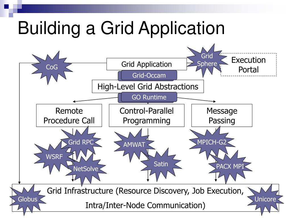 GridSphere CoG Execution Portal Grid Application Grid-Occam Cactus High-Level Grid Abstractions GridLab GAT GO Runtime Remote Procedure Call Control-Parallel Programming MessagePassing Grid RPC MPICH-G2 AMWAT WSRF Satin PACX MPI NetSolve Globus Grid Infrastructure (Resource Discovery, Job Execution, Intra/Inter-Node Communication) Unicore Building a Grid Application