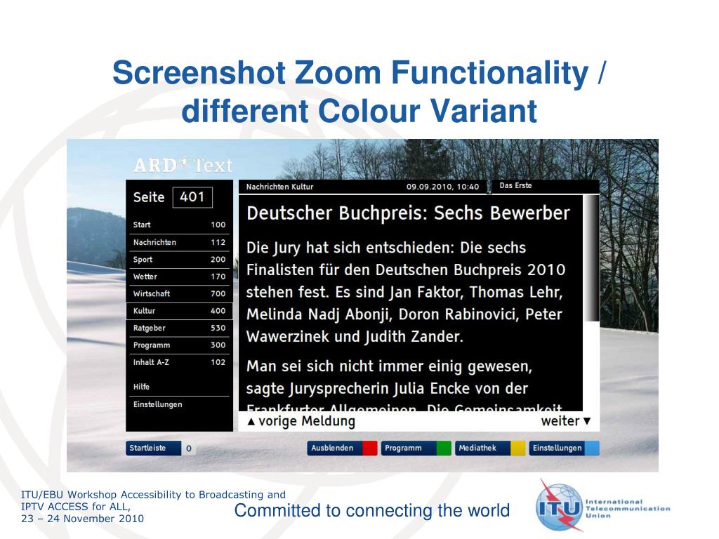 Test HbbTV Text – Results and outlook ARD Text now on air with improved accessibility! Zoom / Magnifier and Colour variations adopted: more colour variants added Enlarged field for entering page numbers New full screen mode – better contrast Better Colour buttons : Solid colours, more contrast Outlook: Provide recommendations to ARD