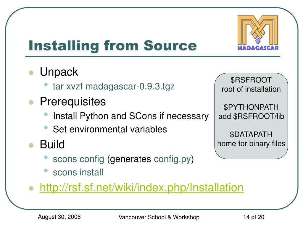 Madagascar Installation. Sergey Fomel University of Texas at Austin August 30, 2006 Vancouver, BC. This Presentation. Introductory remarks History Goals Design principles Installation and compilation Downloading Software construction with SCons File structure. Madagascar Story.
