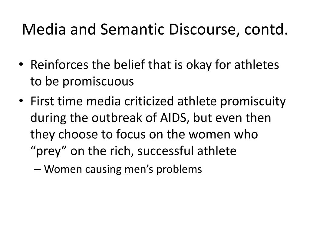 Media and Semantic Discourse, contd. • Reinforces the belief that is okay for athletes to be promiscuous • First time media criticized athlete promiscuity during the outbreak of AIDS, but even then they choose to focus on the women who “prey” on the rich, successful athlete • Women causing men’s problems