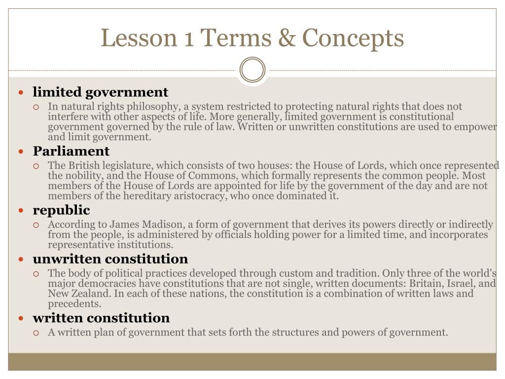 Lesson 1 Terms & Concepts • limited government • In natural rights philosophy, a system restricted to protecting natural rights that does not interfere with other aspects of life. More generally, limited government is constitutional government governed by the rule of law. Written or unwritten constitutions are used to empower and limit government. • Parliament • The British legislature, which consists of two houses: the House of Lords, which once represented the nobility, and the House of Commons, which formally represents the common people. Most members of the House of Lords are appointed for life by the government of the day and are not members of the hereditary aristocracy, who once dominated it. • republic • According to James Madison, a form of government that derives its powers directly or indirectly from the people, is administered by officials holding power for a limited time, and incorporates representative institutions. • unwritten constitution • The body of political practices developed through custom and tradition. Only three of the world's major democracies have constitutions that are not single, written documents: Britain, Israel, and New Zealand. In each of these nations, the constitution is a combination of written laws and precedents. • written constitution • A written plan of government that sets forth the structures and powers of government.