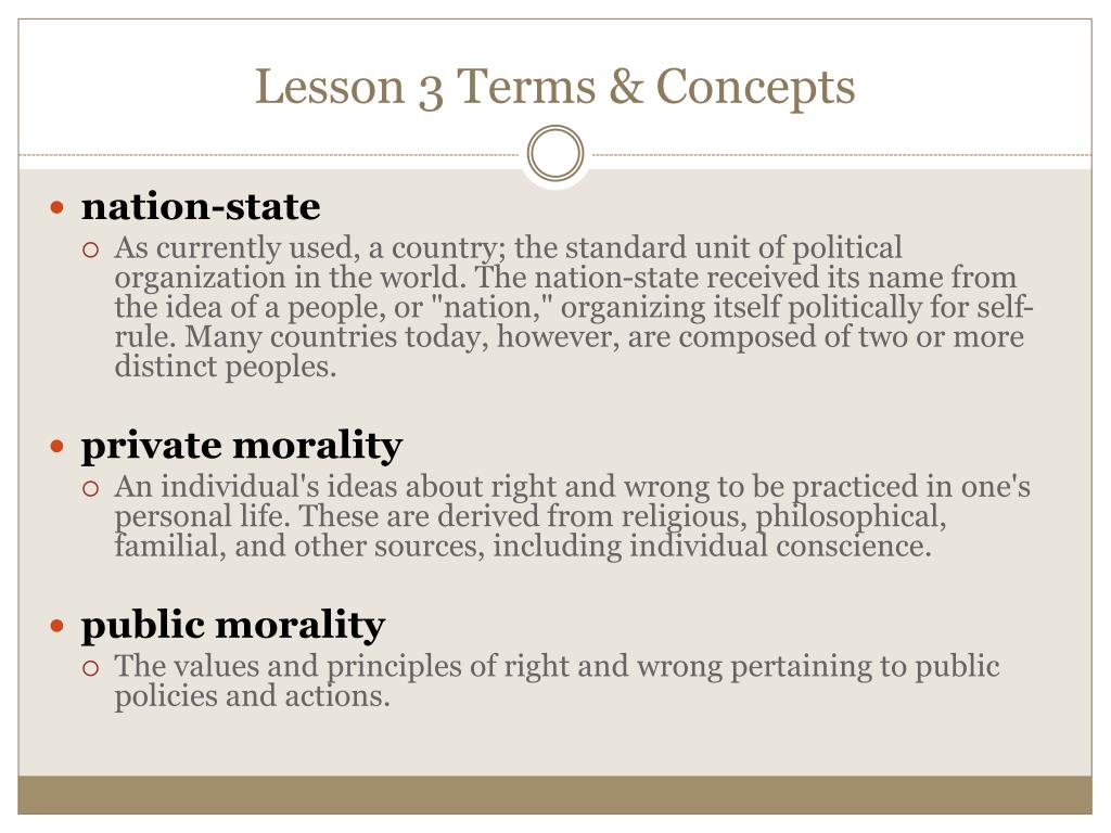 Lesson 3 Terms & Concepts • nation-state • As currently used, a country; the standard unit of political organization in the world. The nation-state received its name from the idea of a people, or "nation," organizing itself politically for self-rule. Many countries today, however, are composed of two or more distinct peoples. • private morality • An individual's ideas about right and wrong to be practiced in one's personal life. These are derived from religious, philosophical, familial, and other sources, including individual conscience. • public morality • The values and principles of right and wrong pertaining to public policies and actions.