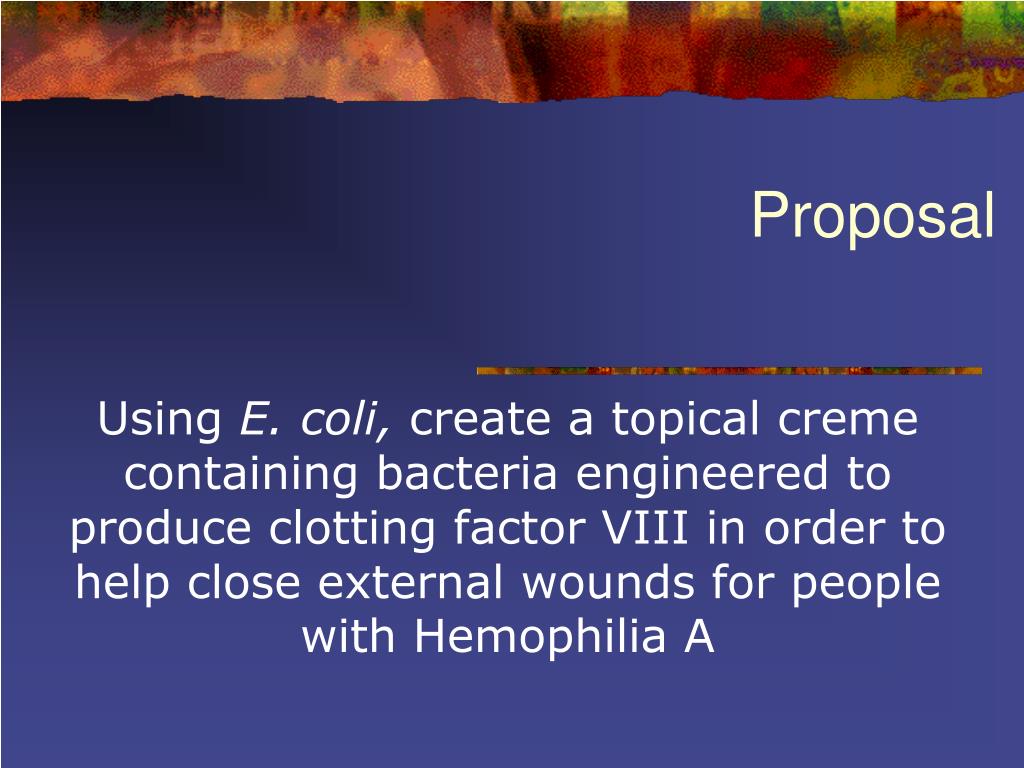 Proposal Using E. coli, create a topical creme containing bacteria engineered to produce clotting factor VIII in order to help close external wounds for people with Hemophilia A