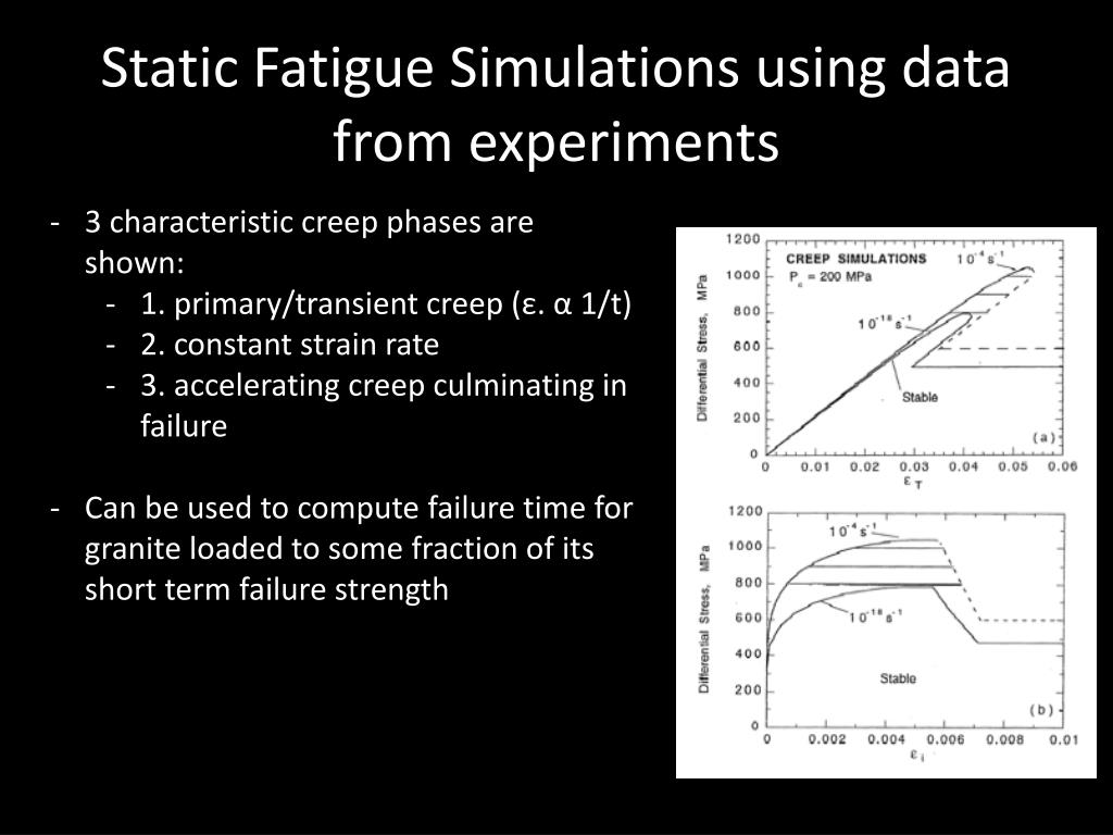 Static Fatigue Simulations using data from experiments • 3 characteristic creep phases are shown: • 1. primary/transient creep (ε. α 1/t) • 2. constant strain rate • 3. accelerating creep culminating in failure • Can be used to compute failure time for granite loaded to some fraction of its short term failure strength