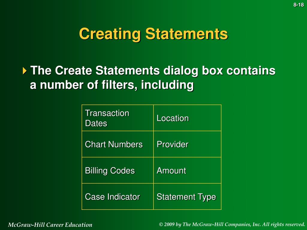 Creating Statements • The Create Statements dialog box contains a number of filters, including