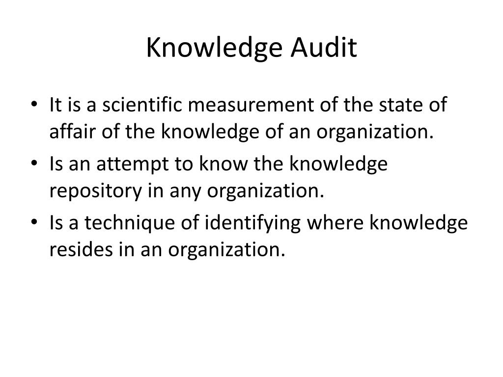 Knowledge Audit • It is a scientific measurement of the state of affair of the knowledge of an organization. • Is an attempt to know the knowledge repository in any organization. • Is a technique of identifying where knowledge resides in an organization.