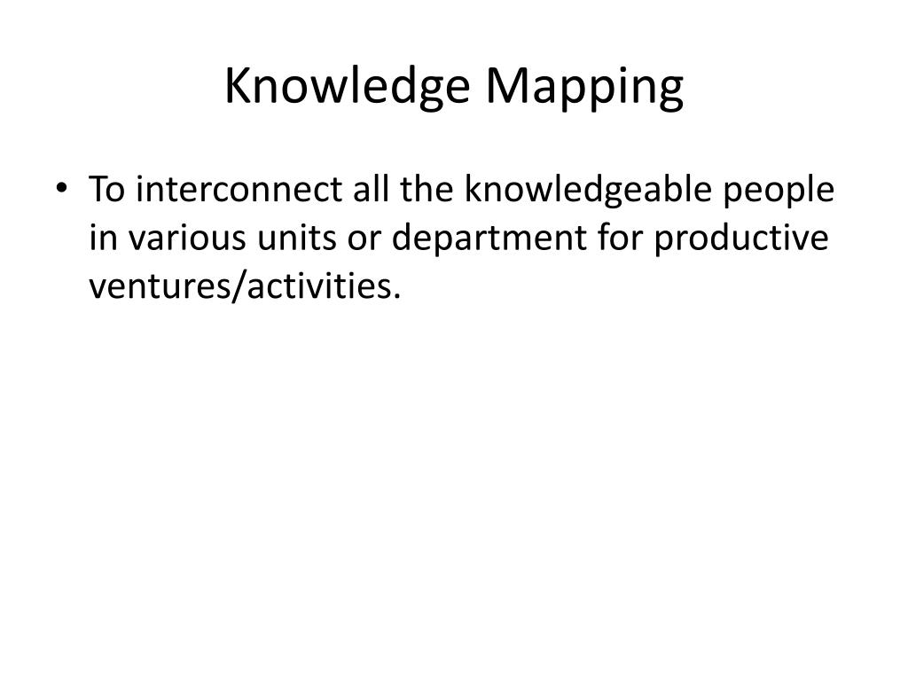 Knowledge Mapping • To interconnect all the knowledgeable people in various units or department for productive ventures/activities.