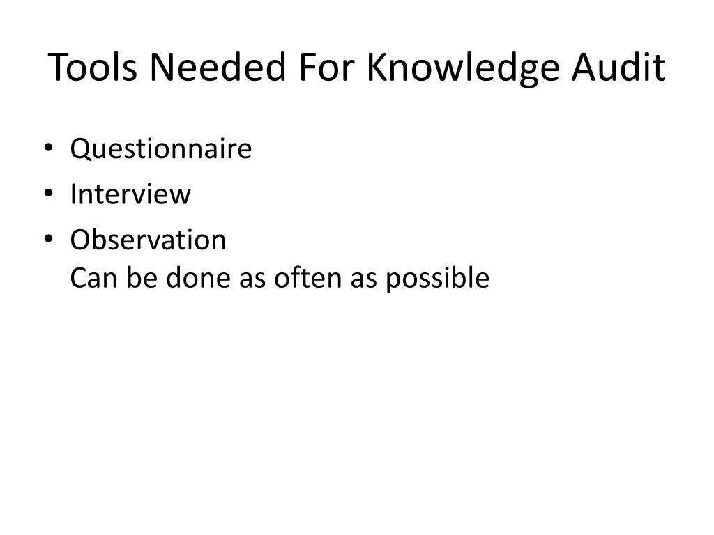 Tools Needed For Knowledge Audit • Questionnaire • Interview • Observation Can be done as often as possible