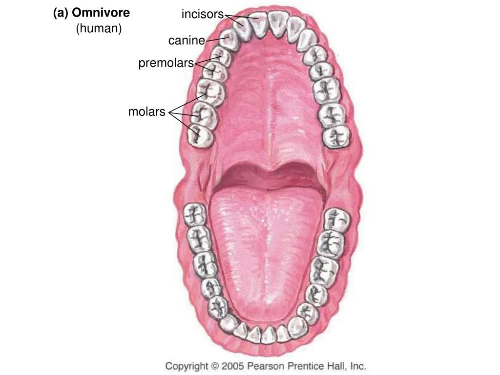 Inside of Mouth: • Saliva is produced at three glands. It dissolves materials, lubricates for swallowing, and contains amylase. • Teeth of three types: incisors for biting,canines for tearing and premolars/molars for grinding food.