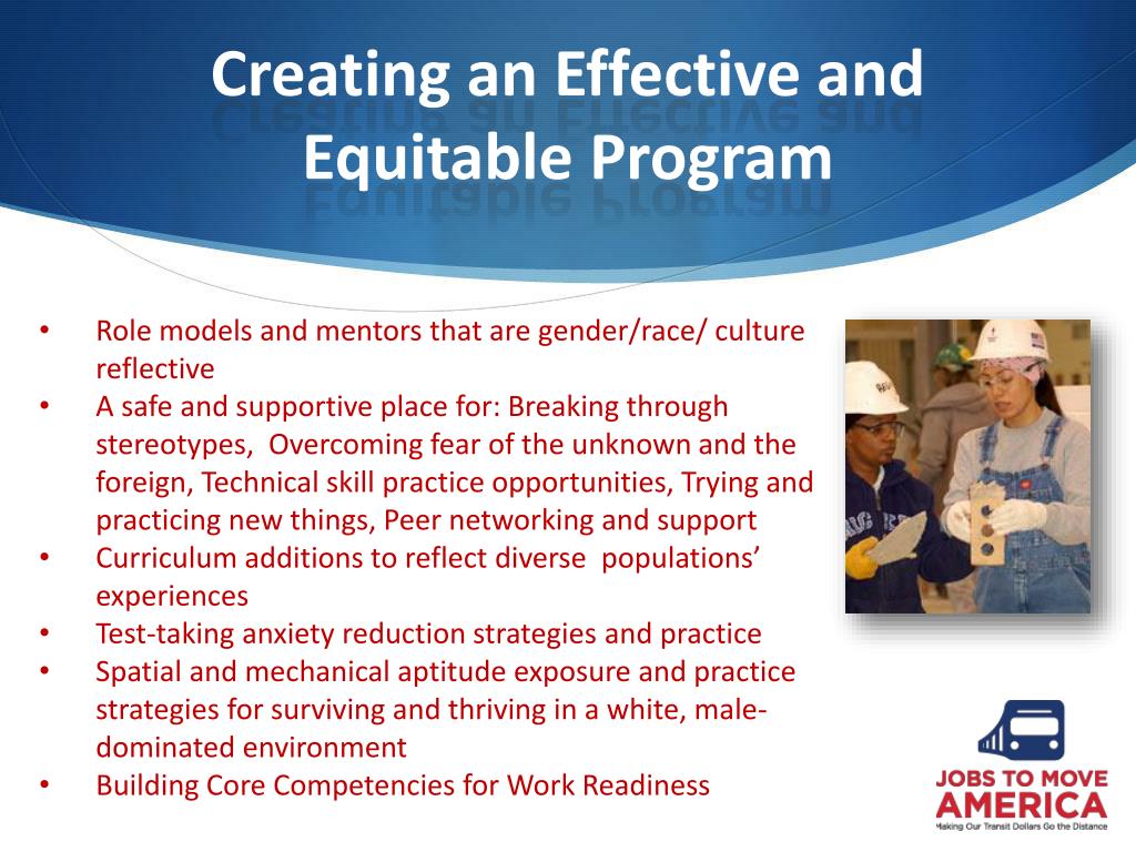 Creating an Effective and Equitable Program • Role models and mentors that are gender/race/ culture reflective • A safe and supportive place for: Breaking through stereotypes, Overcoming fear of the unknown and the foreign, Technical skill practice opportunities, Trying and practicing new things, Peer networking and support • Curriculum additions to reflect diverse populations’ experiences • Test-taking anxiety reduction strategies and practice • Spatial and mechanical aptitude exposure and practice strategies for surviving and thriving in a white, male-dominated environment • Building Core Competencies for Work Readiness