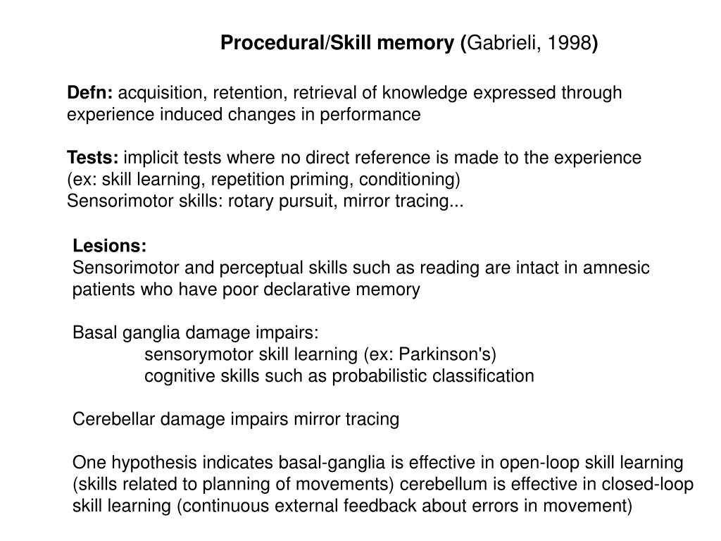 Procedural/Skill memory (Gabrieli, 1998) Defn: acquisition, retention, retrieval of knowledge expressed through experience induced changes in performance Tests: implicit tests where no direct reference is made to the experience (ex: skill learning, repetition priming, conditioning) Sensorimotor skills: rotary pursuit, mirror tracing... Lesions: Sensorimotor and perceptual skills such as reading are intact in amnesic patients who have poor declarative memory Basal ganglia damage impairs: sensorymotor skill learning (ex: Parkinson's) cognitive skills such as probabilistic classification Cerebellar damage impairs mirror tracing One hypothesis indicates basal-ganglia is effective in open-loop skill learning (skills related to planning of movements) cerebellum is effective in closed-loop skill learning (continuous external feedback about errors in movement)