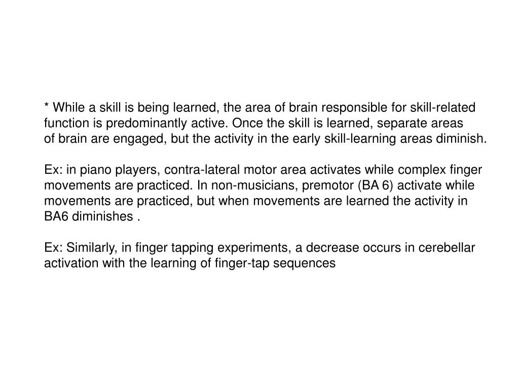 * While a skill is being learned, the area of brain responsible for skill-related function is predominantly active. Once the skill is learned, separate areas of brain are engaged, but the activity in the early skill-learning areas diminish. Ex: in piano players, contra-lateral motor area activates while complex finger movements are practiced. In non-musicians, premotor (BA 6) activate while movements are practiced, but when movements are learned the activity in BA6 diminishes . Ex: Similarly, in finger tapping experiments, a decrease occurs in cerebellar activation with the learning of finger-tap sequences