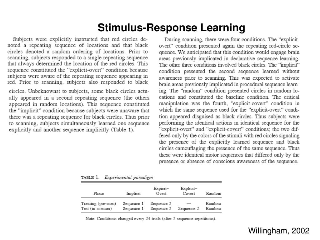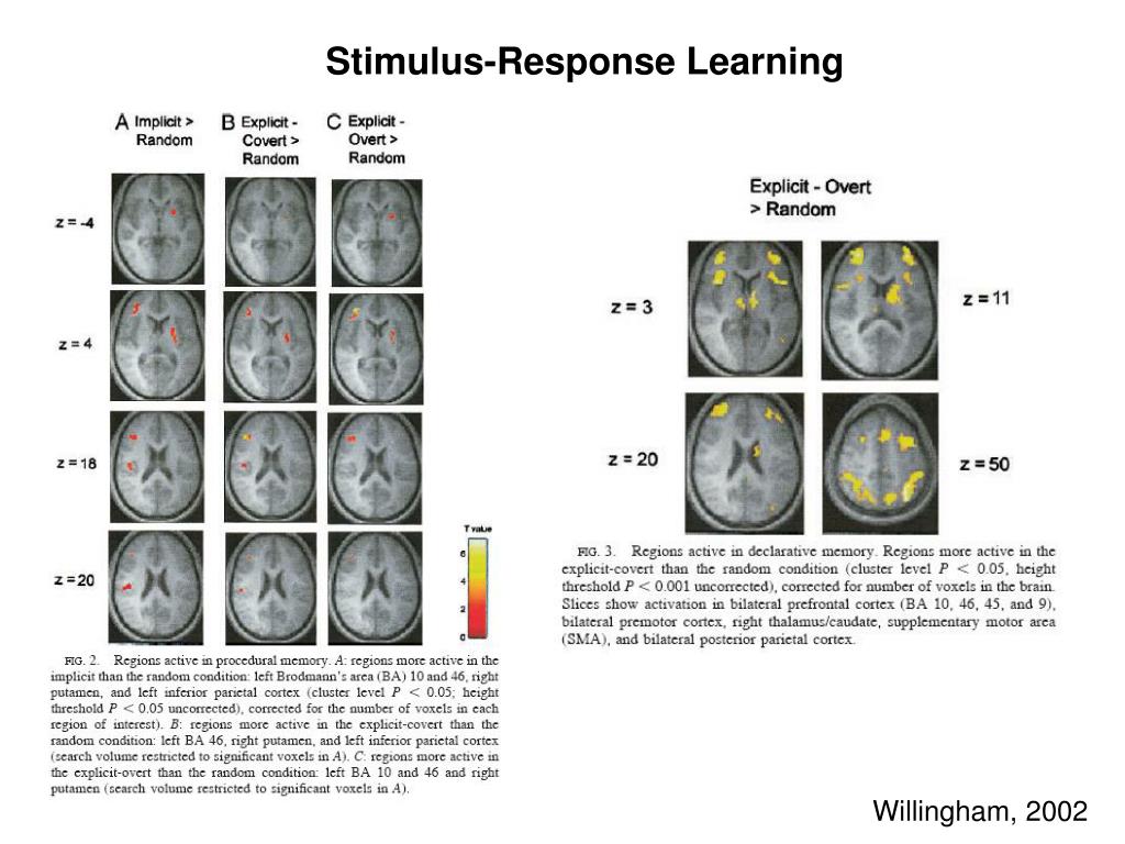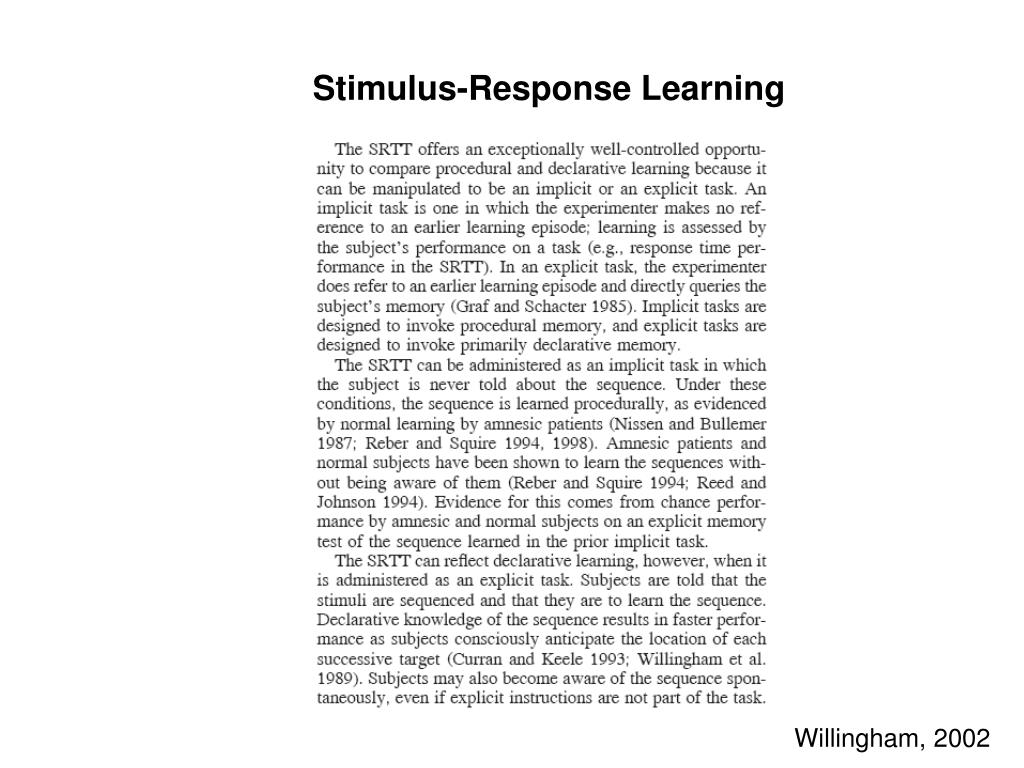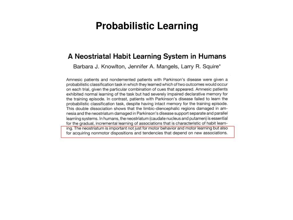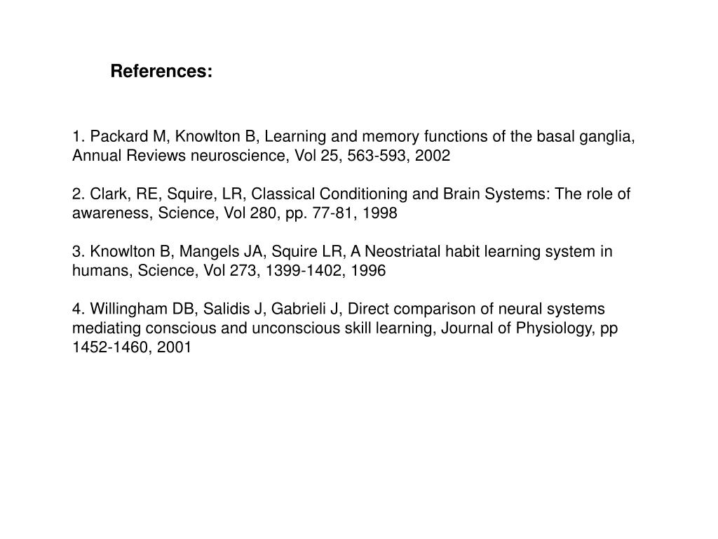 References: 1. Packard M, Knowlton B, Learning and memory functions of the basal ganglia, Annual Reviews neuroscience, Vol 25, 563-593, 2002 2. Clark, RE, Squire, LR, Classical Conditioning and Brain Systems: The role of awareness, Science, Vol 280, pp. 77-81, 1998 3. Knowlton B, Mangels JA, Squire LR, A Neostriatal habit learning system in humans, Science, Vol 273, 1399-1402, 1996 4. Willingham DB, Salidis J, Gabrieli J, Direct comparison of neural systems mediating conscious and unconscious skill learning, Journal of Physiology, pp 1452-1460, 2001