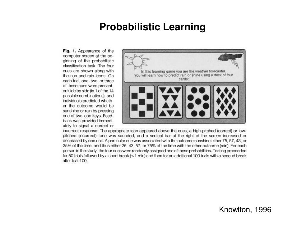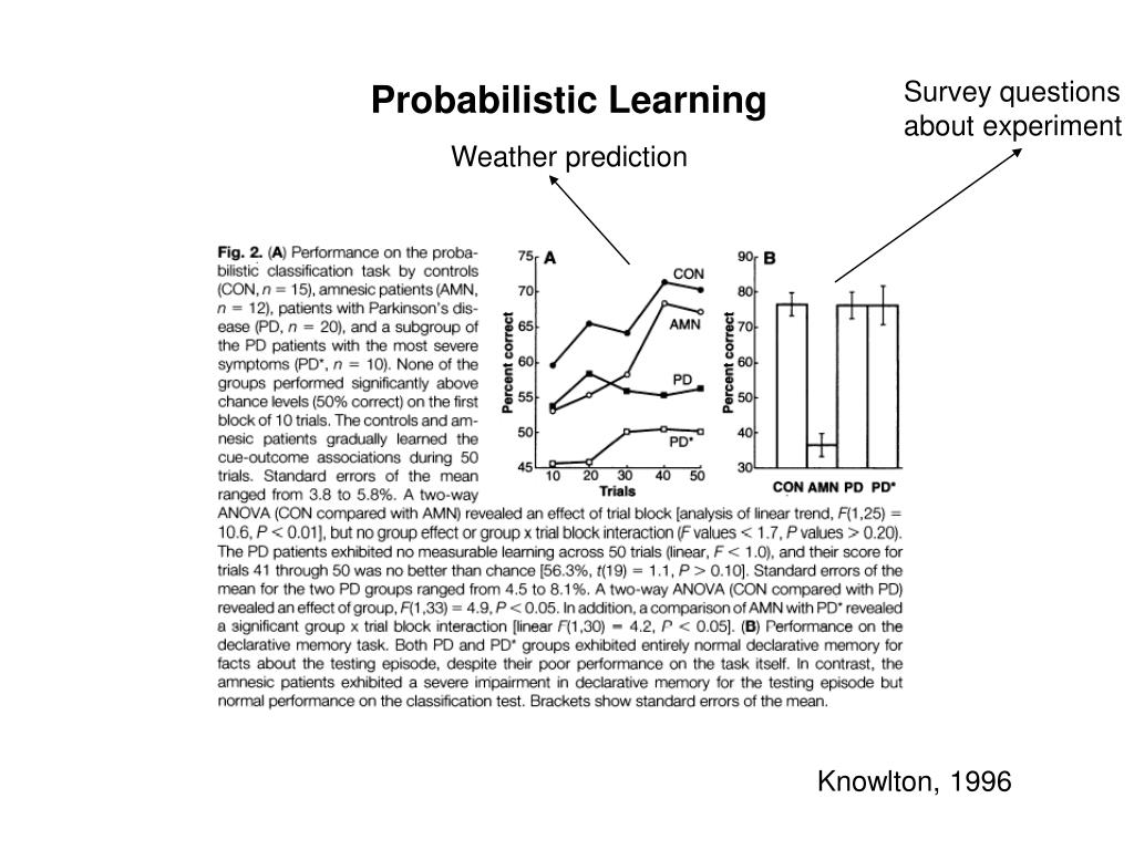 Survey questions about experiment Probabilistic Learning Weather prediction Knowlton, 1996