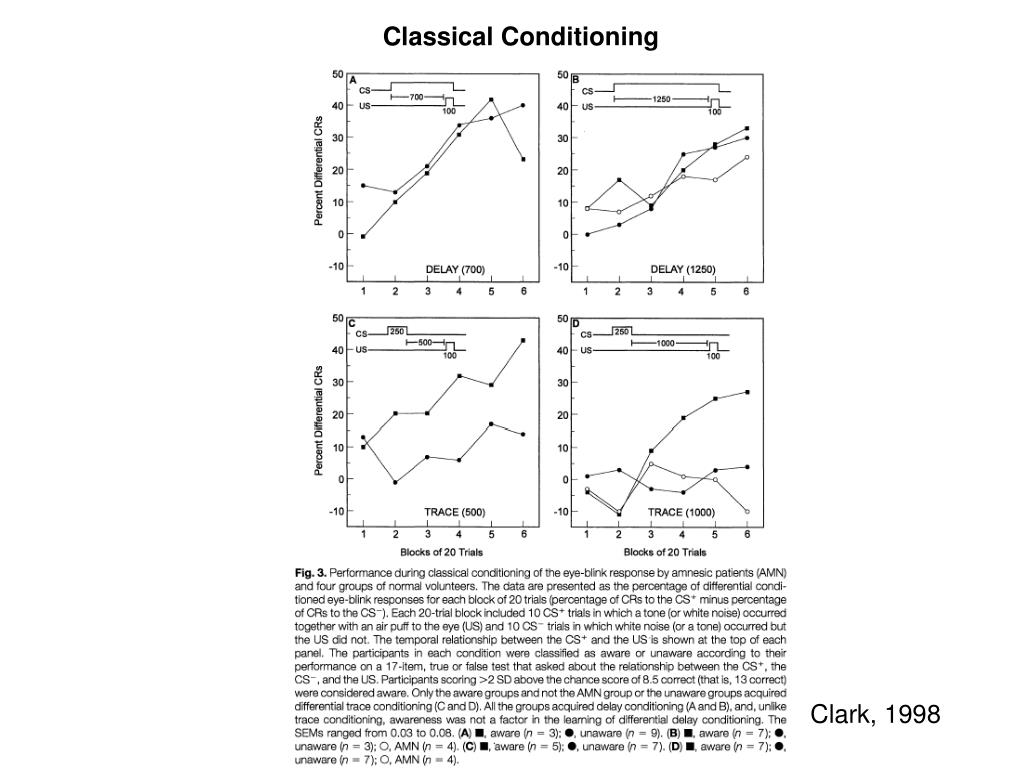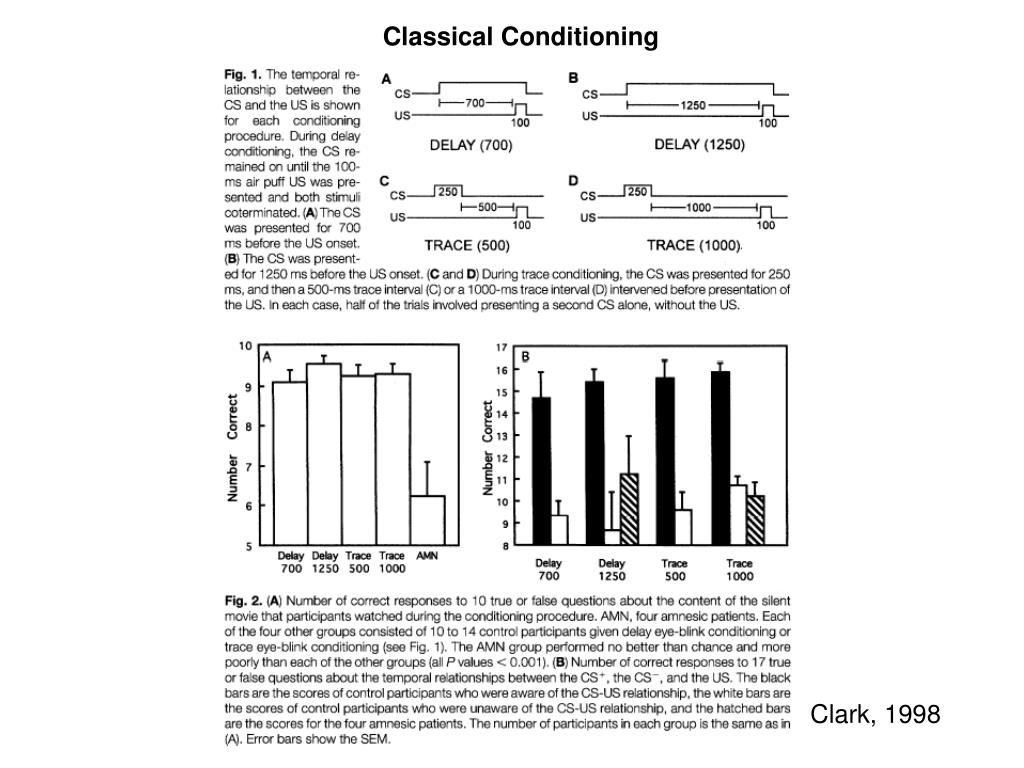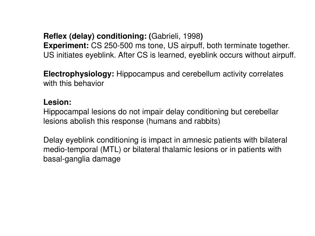 Reflex (delay) conditioning: (Gabrieli, 1998) Experiment: CS 250-500 ms tone, US airpuff, both terminate together. US initiates eyeblink. After CS is learned, eyeblink occurs without airpuff. Electrophysiology: Hippocampus and cerebellum activity correlates with this behavior Lesion: Hippocampal lesions do not impair delay conditioning but cerebellar lesions abolish this response (humans and rabbits) Delay eyeblink conditioning is impact in amnesic patients with bilateral medio-temporal (MTL) or bilateral thalamic lesions or in patients with basal-ganglia damage