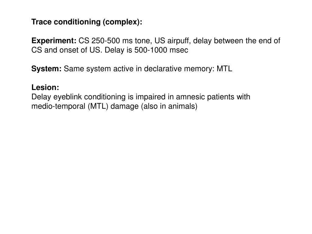 Trace conditioning (complex): Experiment: CS 250-500 ms tone, US airpuff, delay between the end of CS and onset of US. Delay is 500-1000 msec System: Same system active in declarative memory: MTL Lesion: Delay eyeblink conditioning is impaired in amnesic patients with medio-temporal (MTL) damage (also in animals)