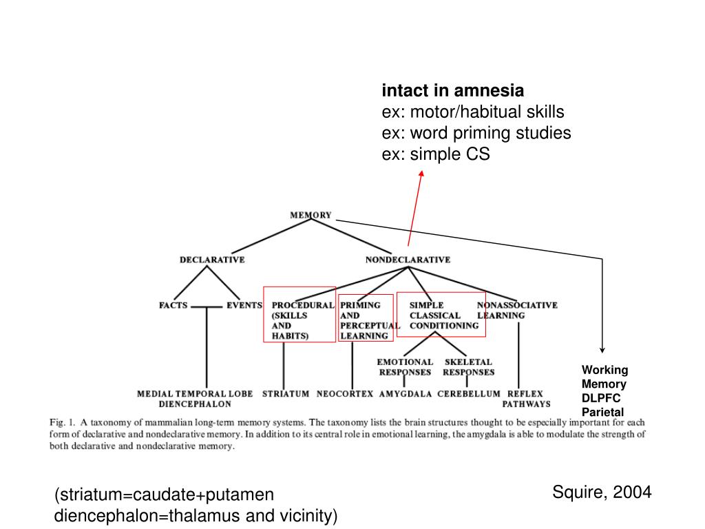 intact in amnesia ex: motor/habitual skills ex: word priming studies ex: simple CS Working Memory DLPFC Parietal Squire, 2004 (striatum=caudate+putamen diencephalon=thalamus and vicinity)