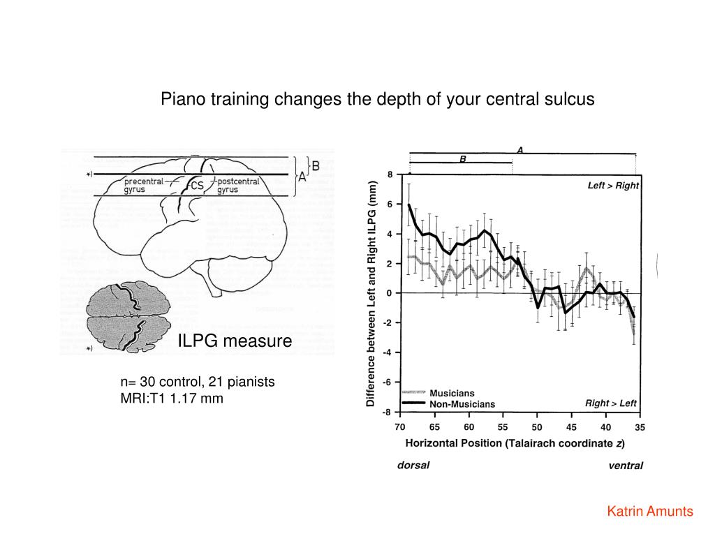 Piano training changes the depth of your central sulcus ILPG measure n= 30 control, 21 pianists MRI:T1 1.17 mm Katrin Amunts