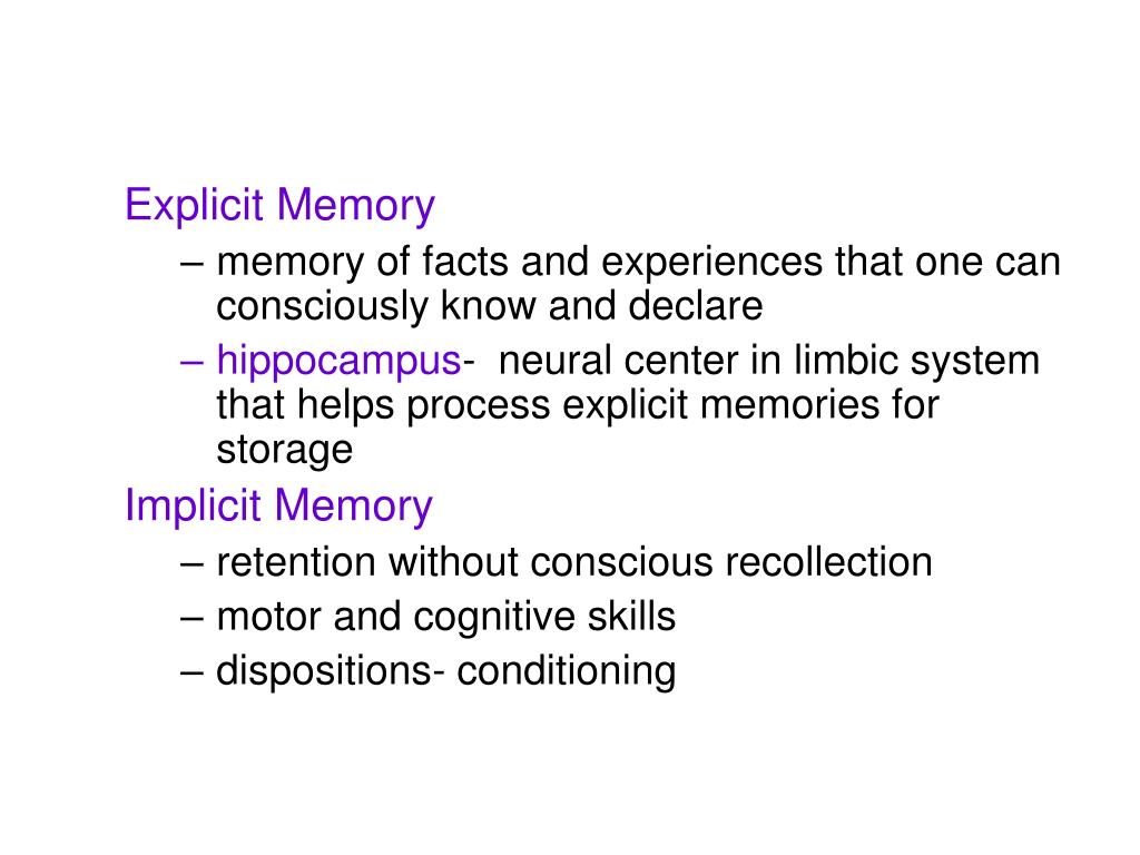 Explicit Memory • memory of facts and experiences that one can consciously know and declare • hippocampus- neural center in limbic system that helps process explicit memories for storage Implicit Memory • retention without conscious recollection • motor and cognitive skills • dispositions- conditioning