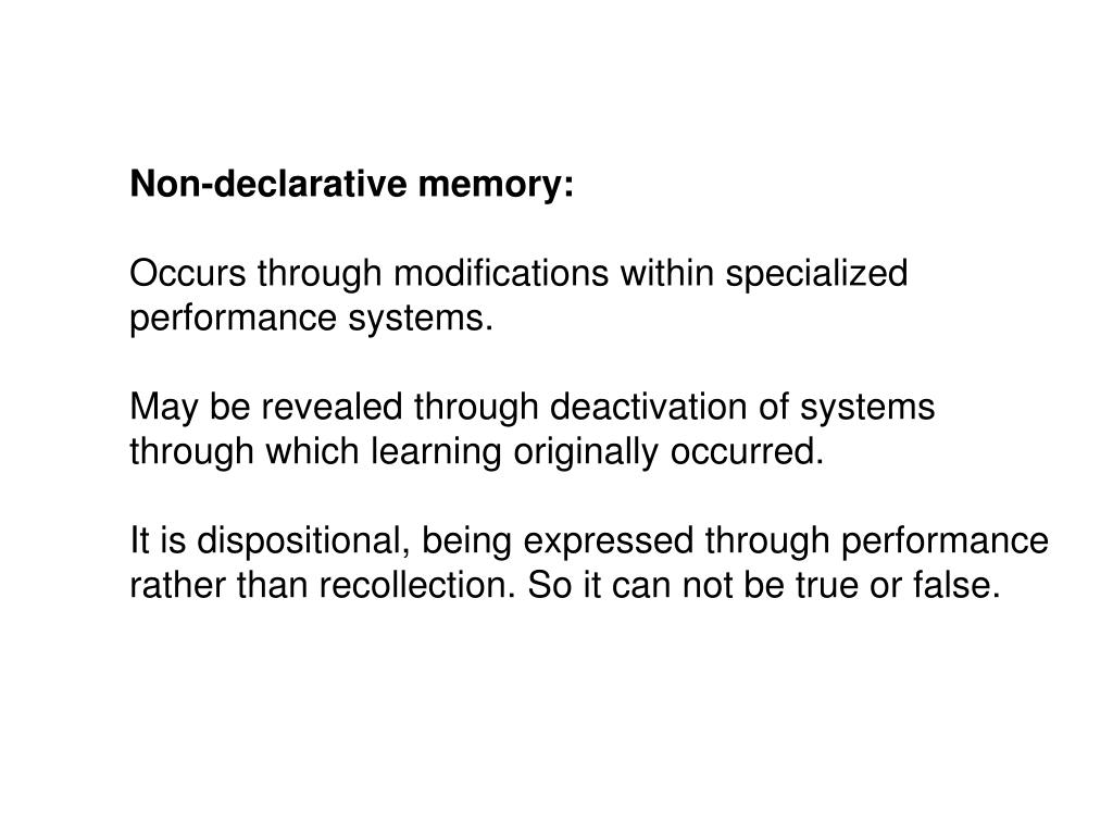Non-declarative memory: Occurs through modifications within specialized performance systems. May be revealed through deactivation of systems through which learning originally occurred. It is dispositional, being expressed through performance rather than recollection. So it can not be true or false.