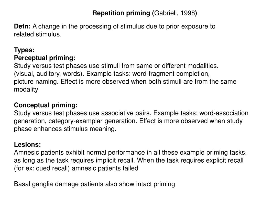 Repetition priming (Gabrieli, 1998) Defn: A change in the processing of stimulus due to prior exposure to related stimulus. Types: Perceptual priming: Study versus test phases use stimuli from same or different modalities. (visual, auditory, words). Example tasks: word-fragment completion, picture naming. Effect is more observed when both stimuli are from the same modality Conceptual priming: Study versus test phases use associative pairs. Example tasks: word-association generation, category-examplar generation. Effect is more observed when study phase enhances stimulus meaning. Lesions: Amnesic patients exhibit normal performance in all these example priming tasks. as long as the task requires implicit recall. When the task requires explicit recall (for ex: cued recall) amnesic patients failed Basal ganglia damage patients also show intact priming