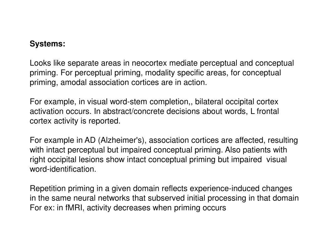 Systems: Looks like separate areas in neocortex mediate perceptual and conceptual priming. For perceptual priming, modality specific areas, for conceptual priming, amodal association cortices are in action. For example, in visual word-stem completion,, bilateral occipital cortex activation occurs. In abstract/concrete decisions about words, L frontal cortex activity is reported. For example in AD (Alzheimer's), association cortices are affected, resulting with intact perceptual but impaired conceptual priming. Also patients with right occipital lesions show intact conceptual priming but impaired visual word-identification. Repetition priming in a given domain reflects experience-induced changes in the same neural networks that subserved initial processing in that domain For ex: in fMRI, activity decreases when priming occurs