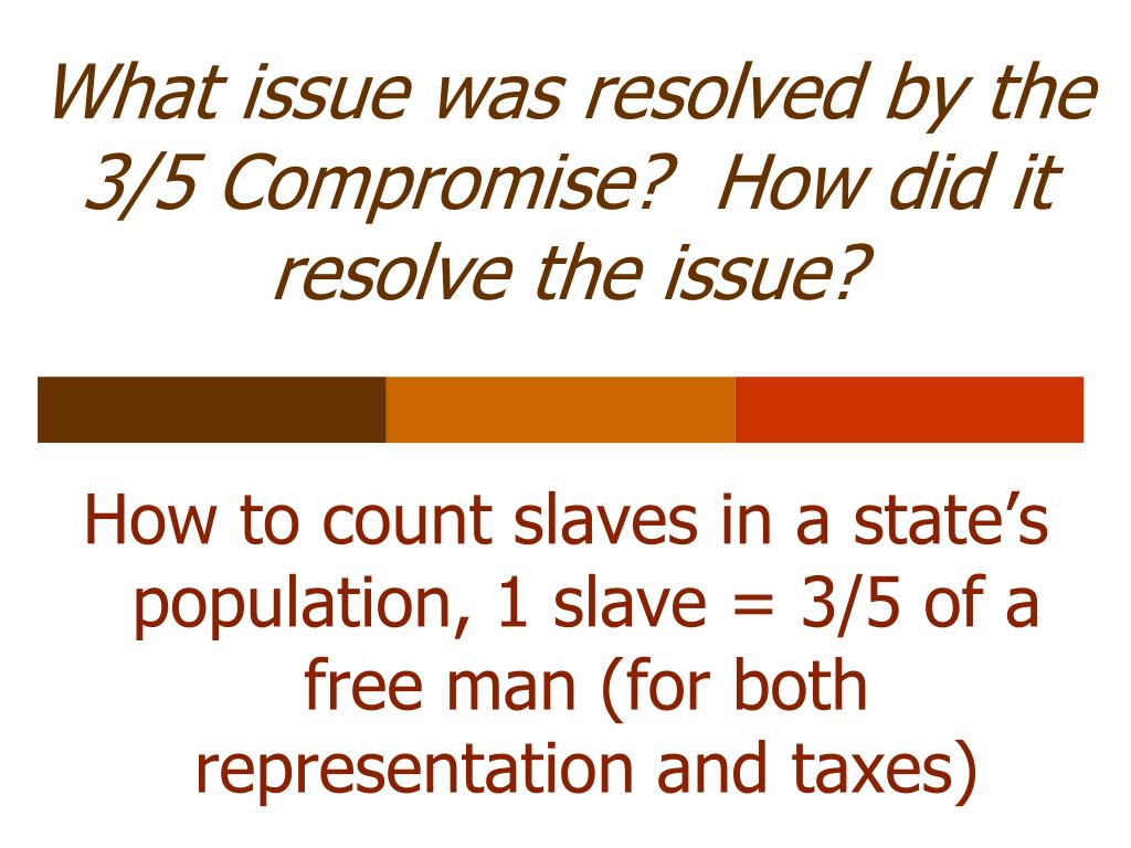 What issue was resolved by the 3/5 Compromise? How did it resolve the issue? • How to count slaves in a state’s population, 1 slave = 3/5 of a free man (for both representation and taxes)
